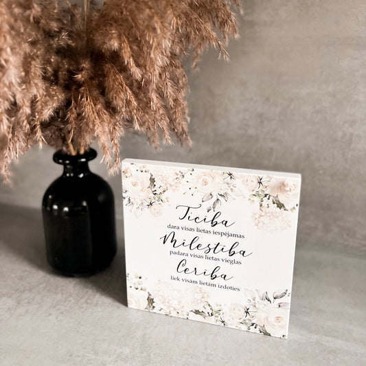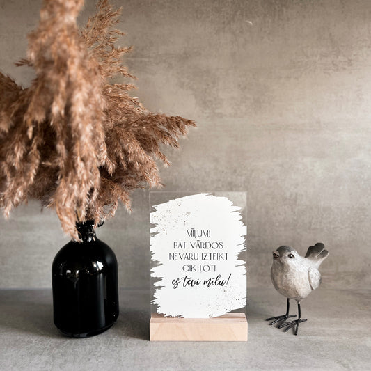 ORGANISKĀ STIKLA DEKORS "MĪĻUM! ES TEVI MĪLU" AR BALTU PAMATU