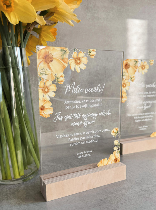 "MĪĻIE VECĀKI!" ORGANISKĀ STIKLA DEKORS KOKA STATĪVĀ