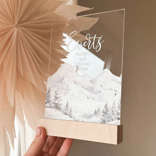 "KALNI" ORGANISKĀ STIKLA DZIMŠANAS DEKORS KOKA STATĪVĀ