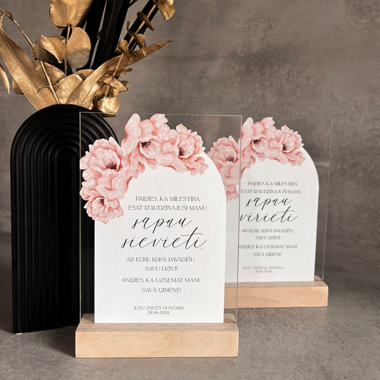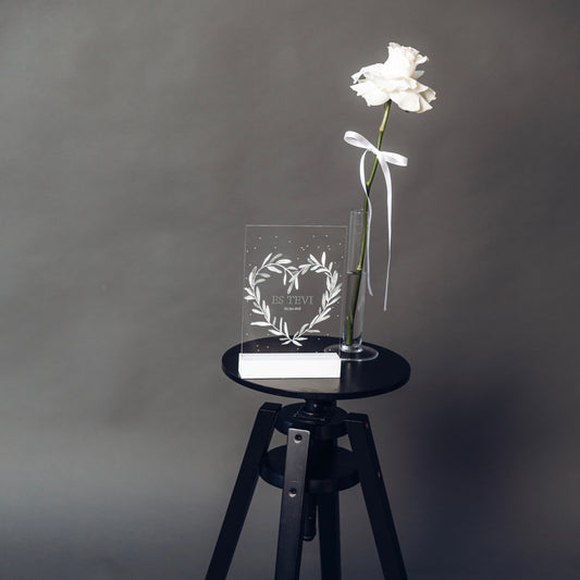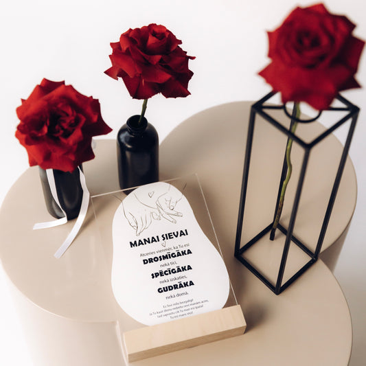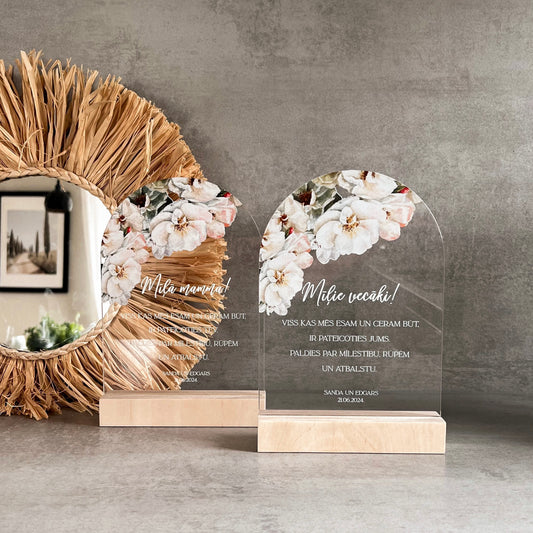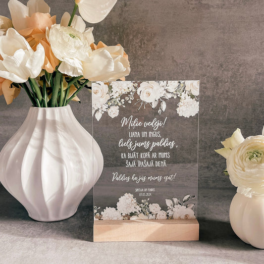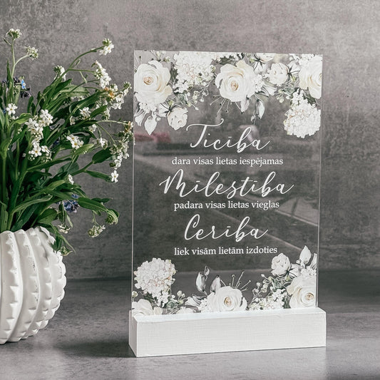 PATEICĪBAS DEKORS "VEDĒJIEM" ORGANISKĀ STIKLA DEKORS KOKA STATĪVĀ
