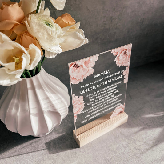 "MĪĻĀ MAMMA!" ORGANISKĀ STIKLA DEKORS KOKA STATĪVĀ (ARKVEIDA FORMA)