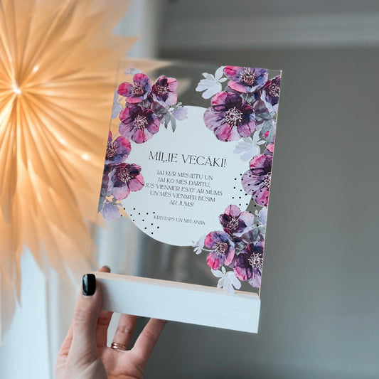 "MĪĻIE VECĀKI!" ORGANISKĀ STIKLA DEKORS KOKA STATĪVĀ