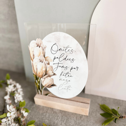 ORGANISKĀ STIKLA DEKORS "VAI BŪSIET MANI KRUSTVECĀKI?" KOKA STATĪVĀ