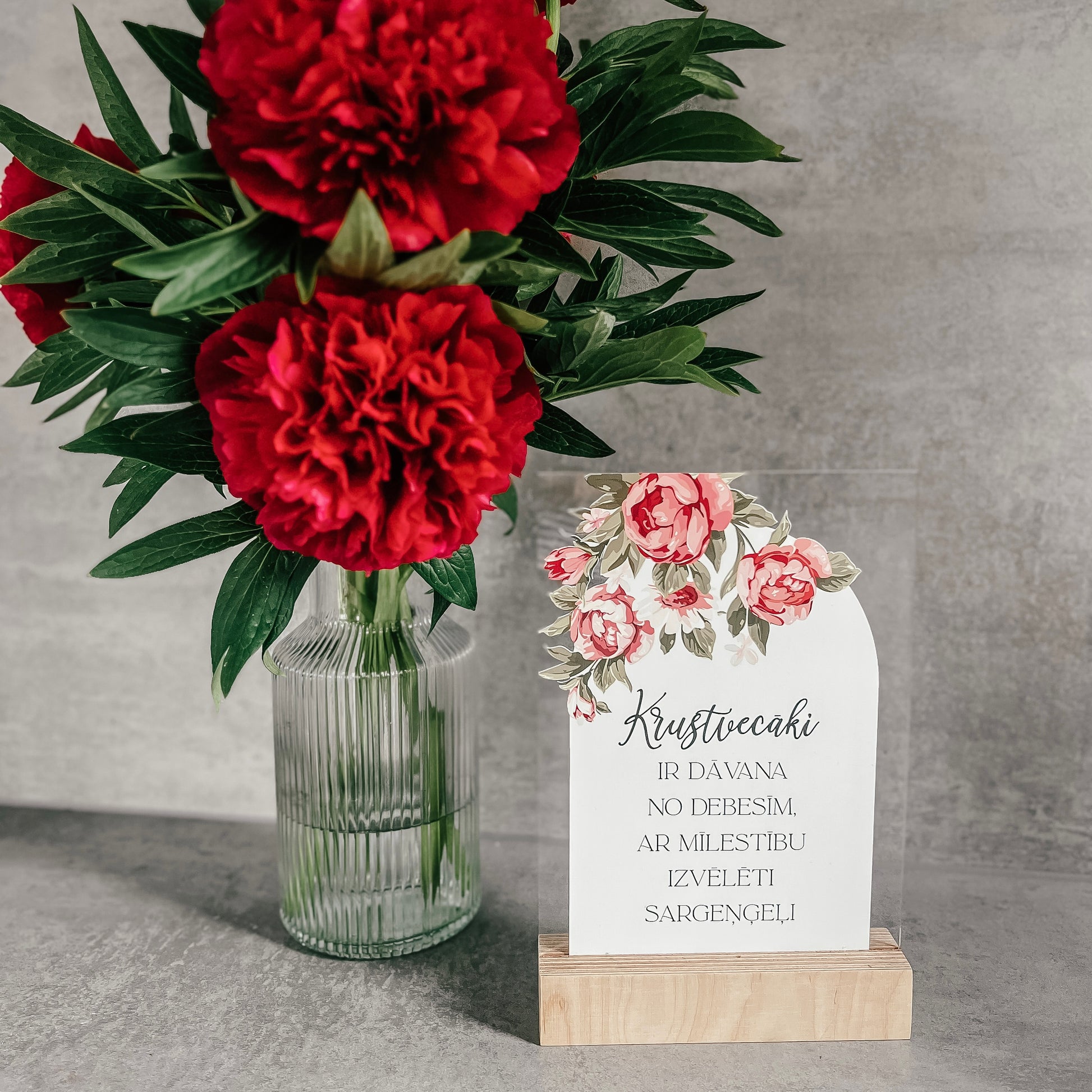 Personalizēts organiskā stikla dekors koka statīvā būs lieliska dāvana krustvecākiem ar skaistu ziedu rakstu un mīļu tekstu. Šis dekors noteikti sasildīs viņu sirsniņas.