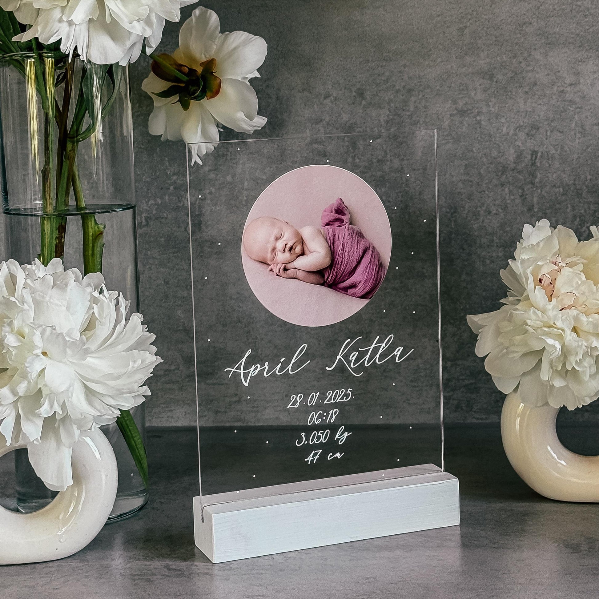 Personalizēts organiskā stikla dekors koka statīvā un pievienoto bērniņa bildi būs lieliska dāvana dodoties uz raudzībām vai bērna dzimšanas dienu!