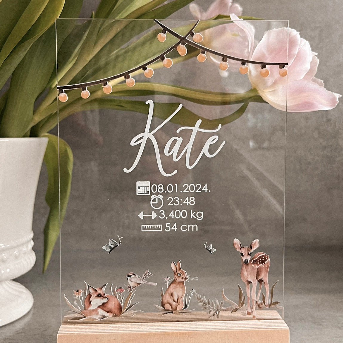 Personalizēts organiskā stikla dekors koka statīvā būs lieliska dāvana dodoties uz raudzībām vai bērna dzimšanas dienu!