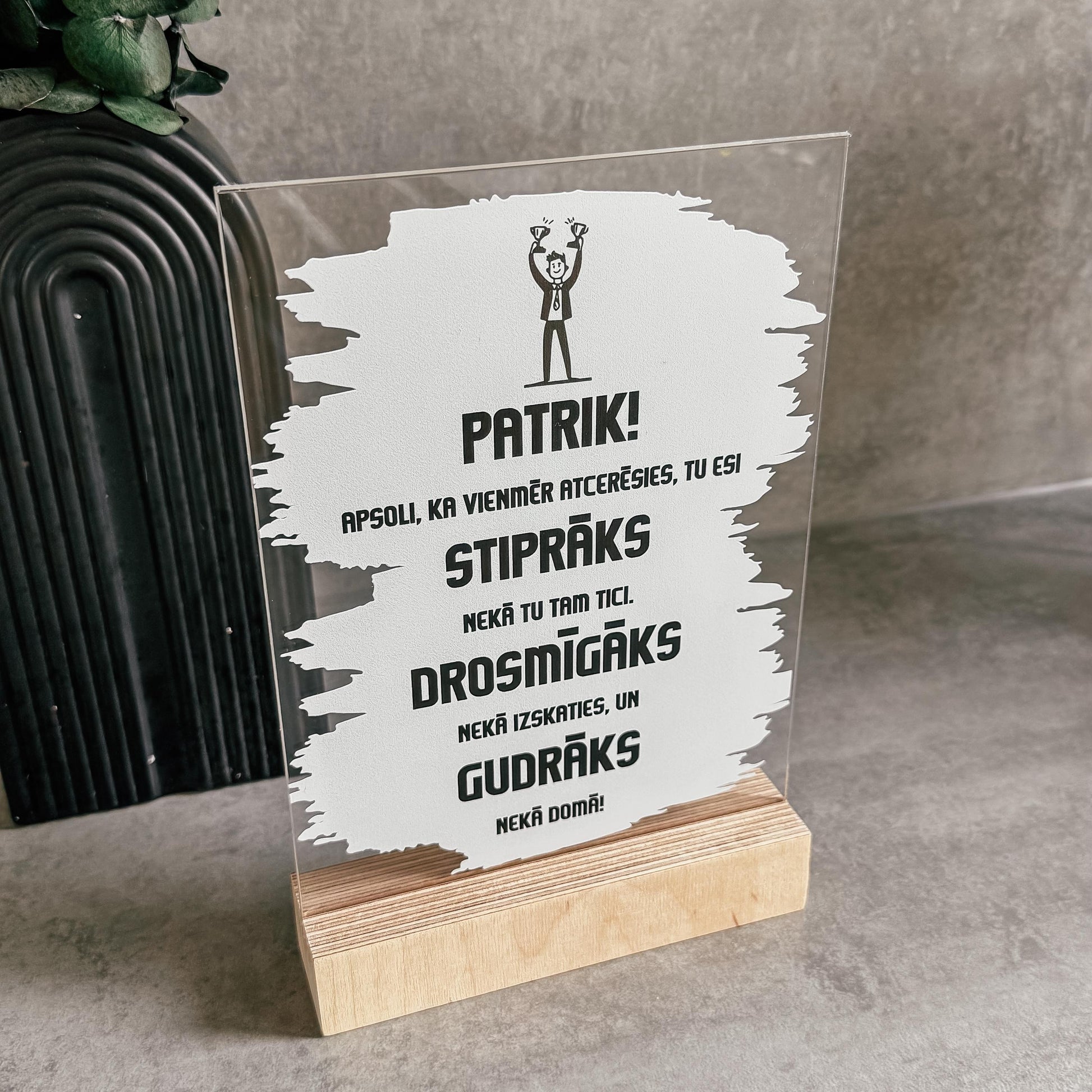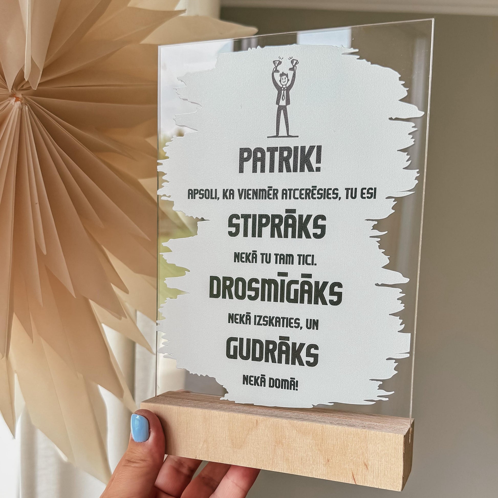 Šis organiskā stikla dekors koka statīvā ar vērtīgiem vārdiem būs kā lieliska dāvana bērna dzimšanas dienā vai pasniedzot to izlaidumā.