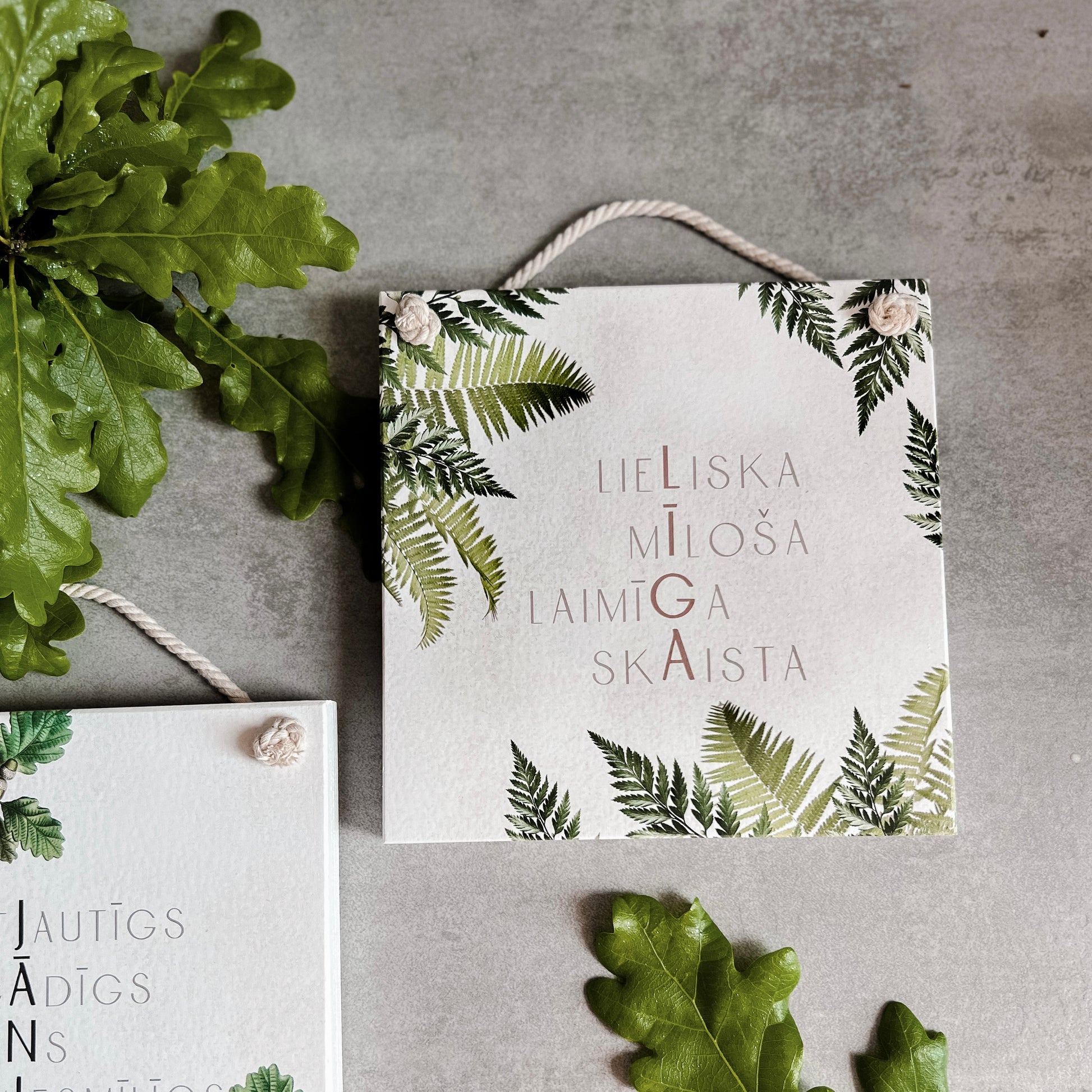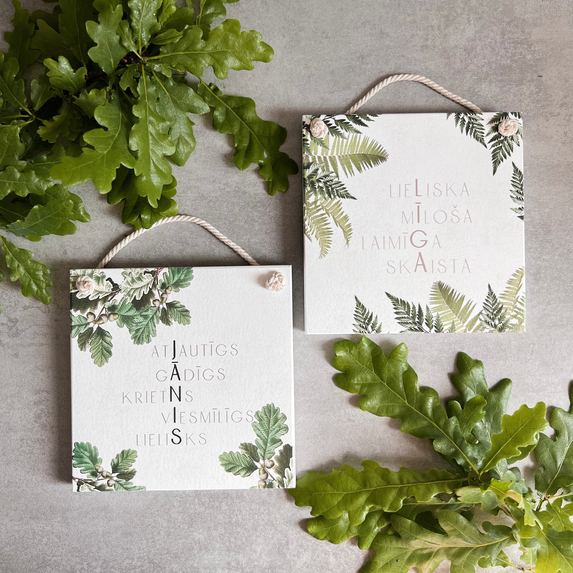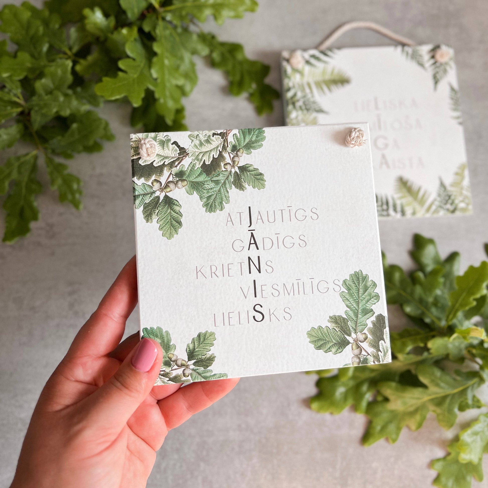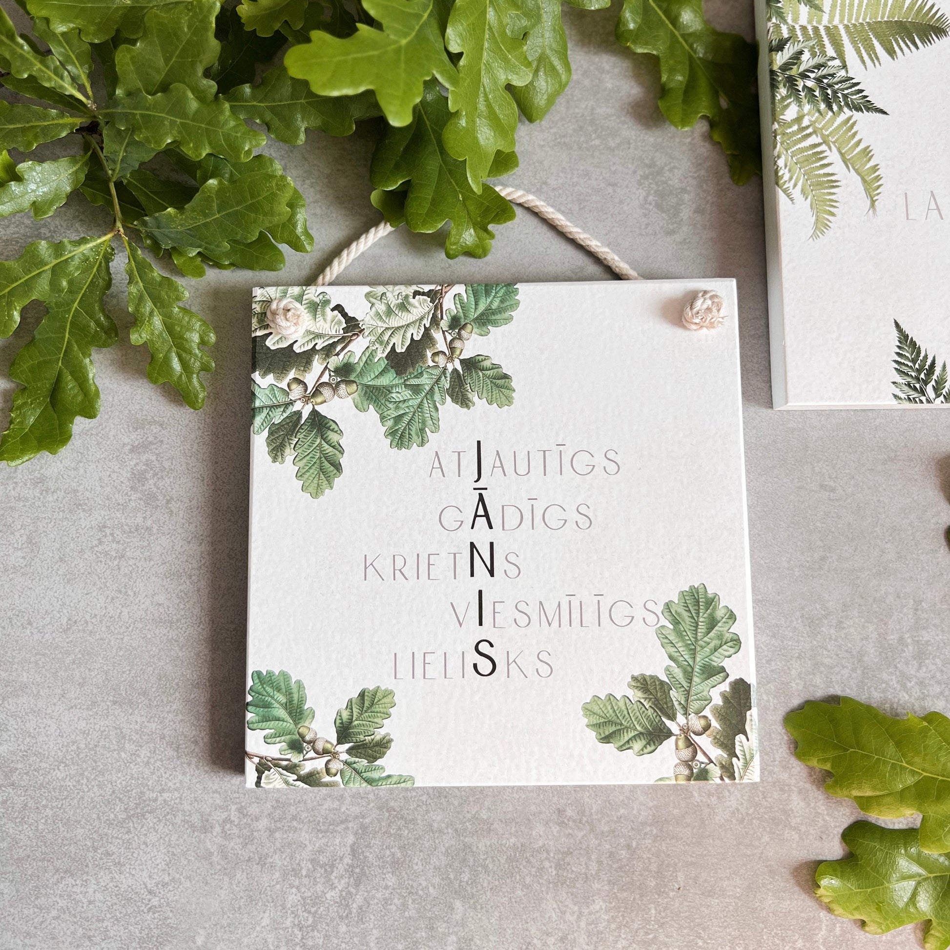 Personalizēts koka dekors ar vārdu un īpašības vārdiem - Jānim un Līgai.