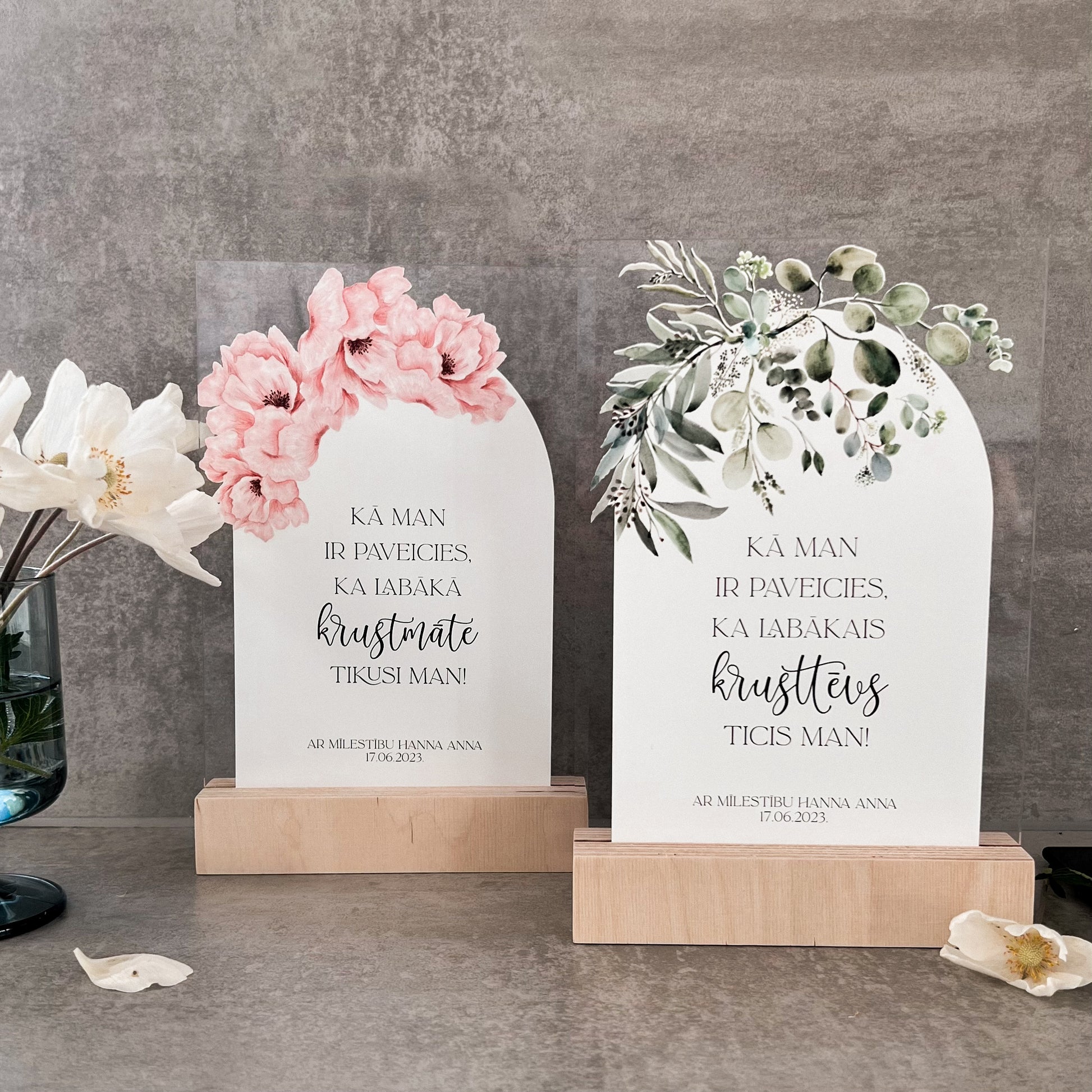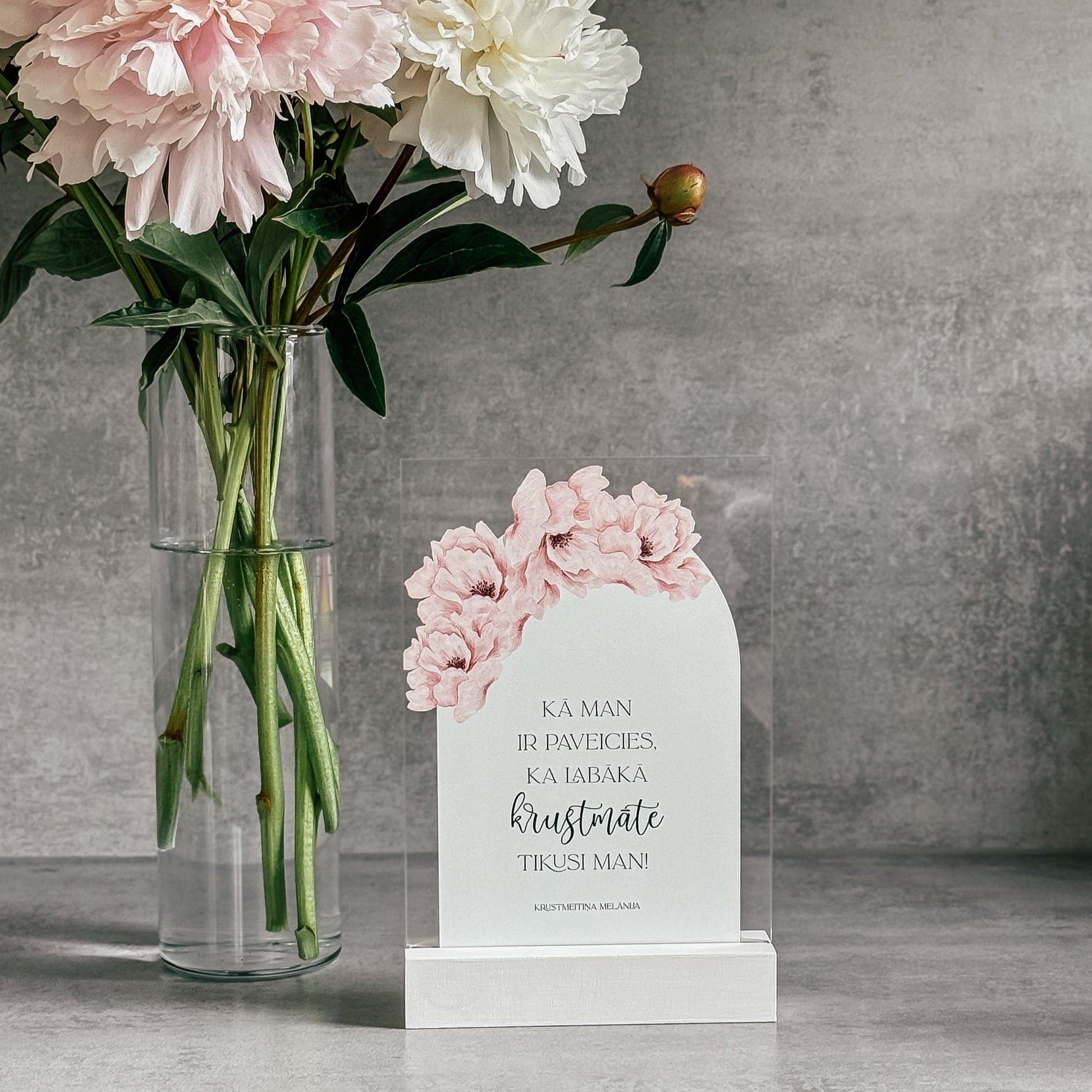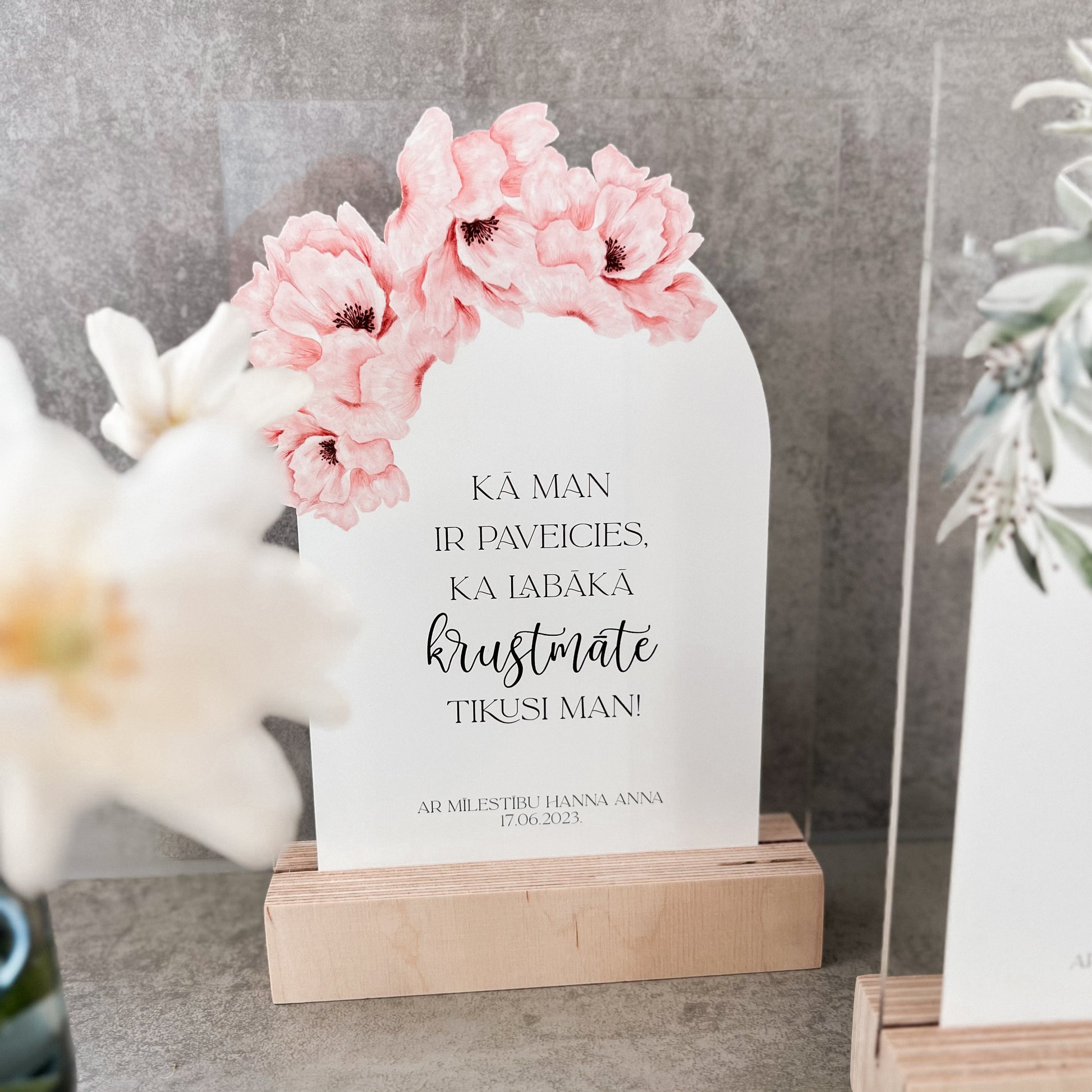 Personalizēts organiskā stikla dekors koka statīvā būs lieliska dāvana krustvecākiem ar skaistu ziedu rakstu un mīļu tekstu. Šis dekors noteikti būs par mīļu atmiņu no kristību dienas!