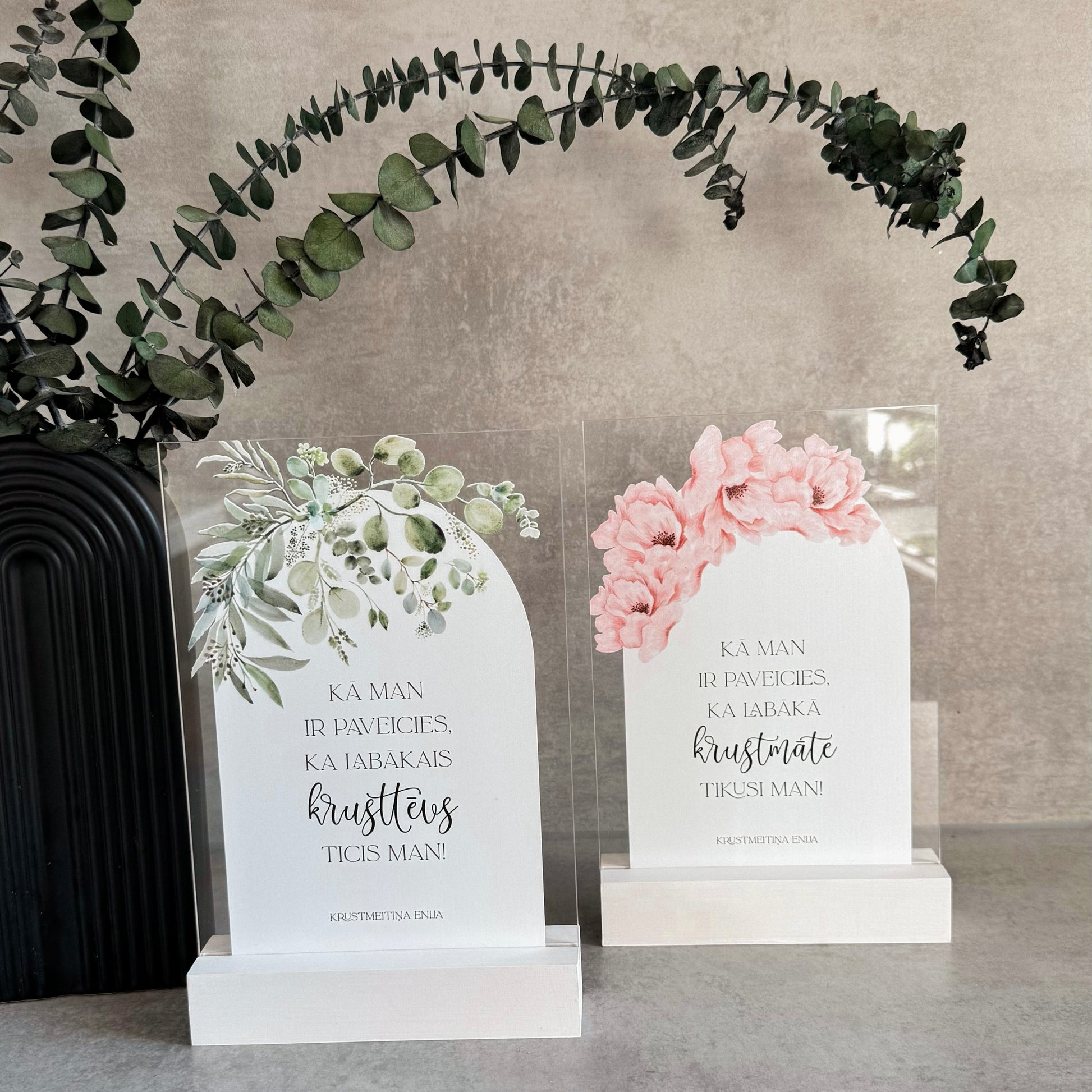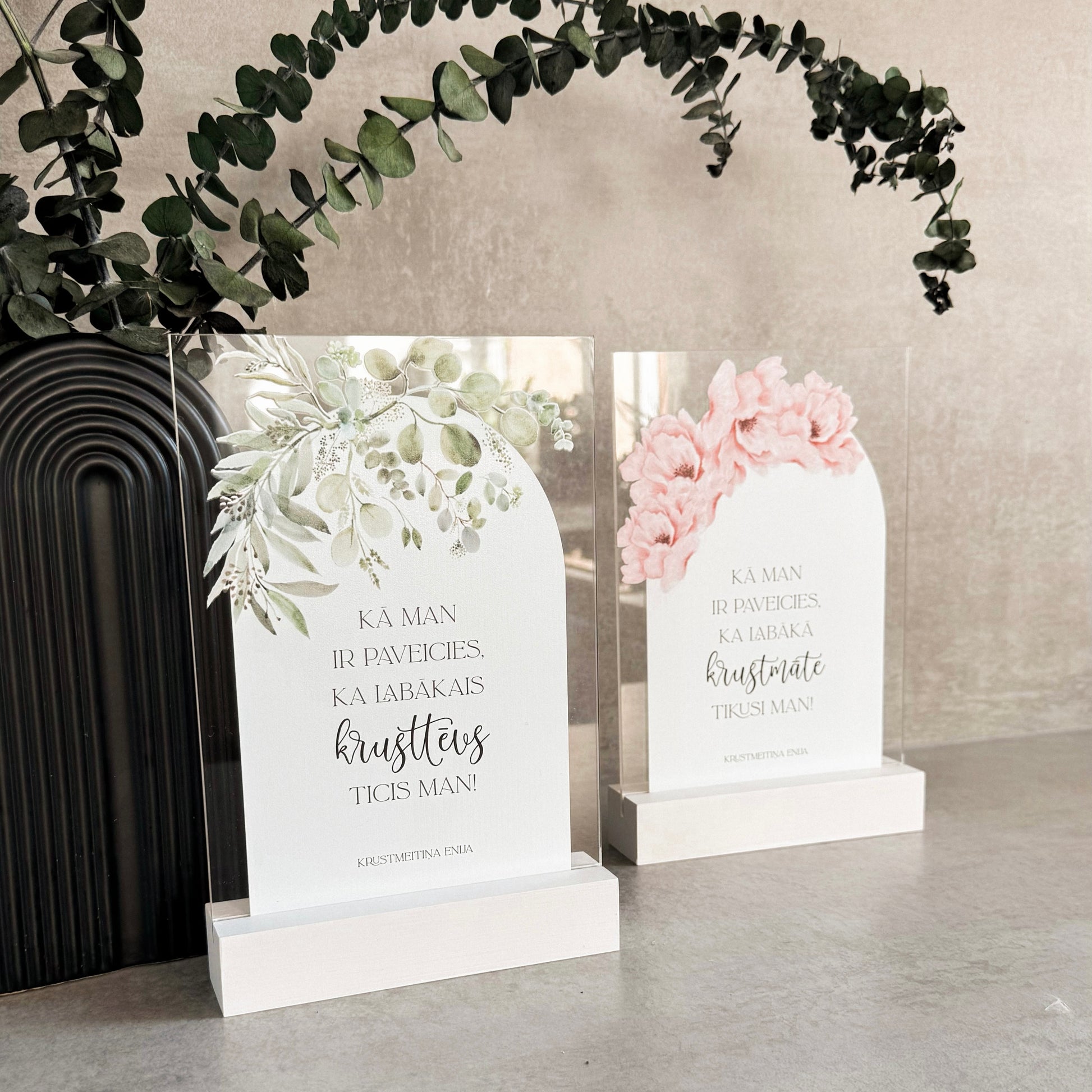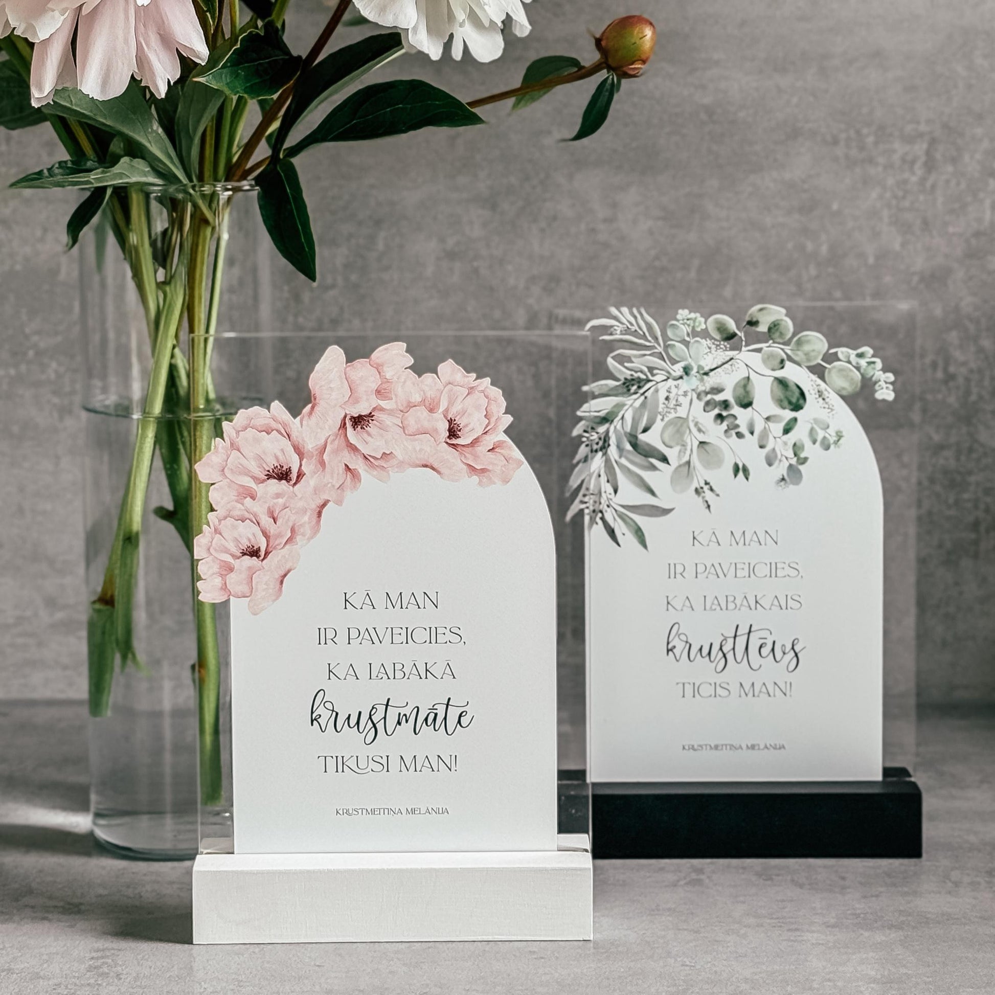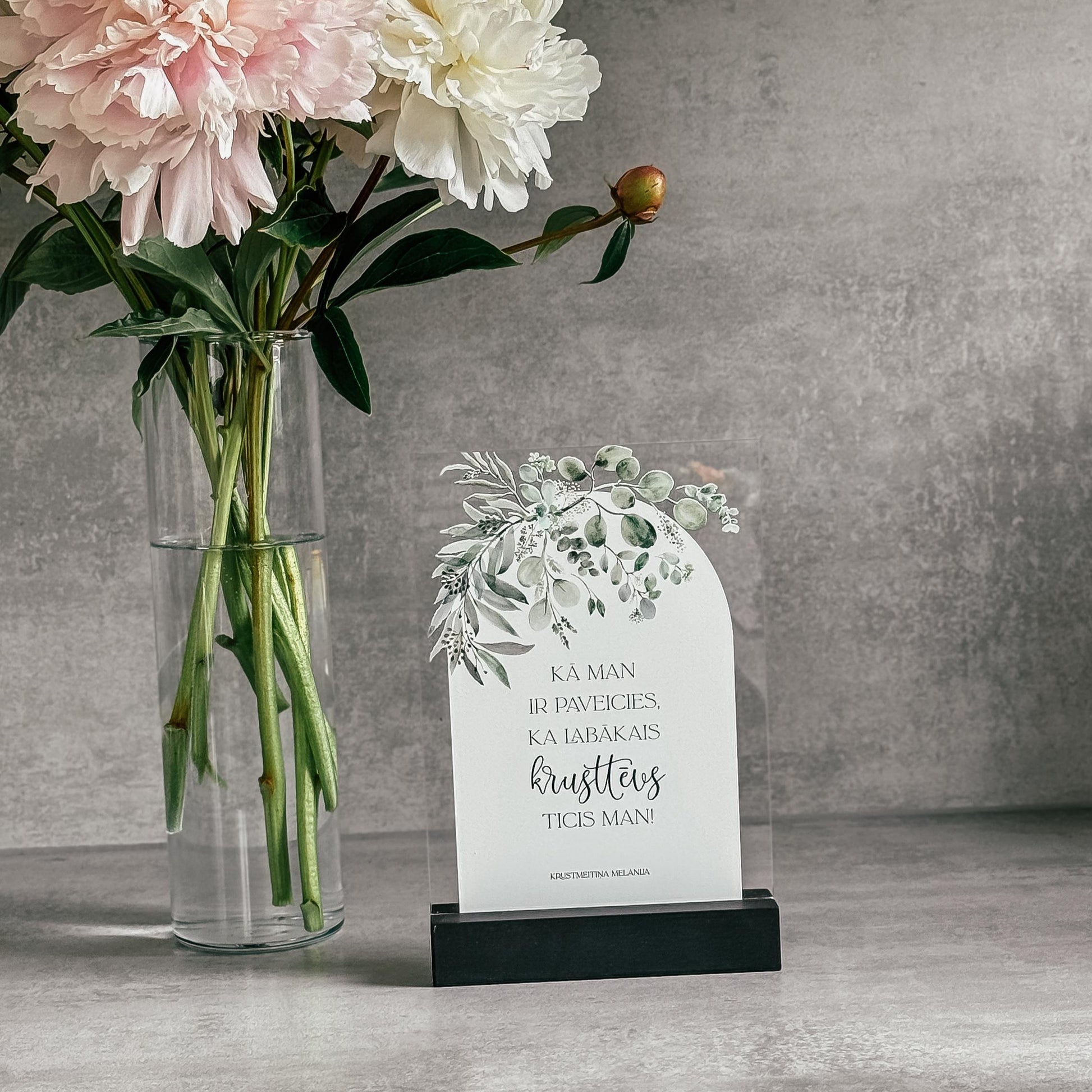 Personalizēts organiskā stikla dekors koka statīvā būs lieliska dāvana krustvecākiem ar skaistu ziedu rakstu un mīļu tekstu. Šis dekors noteikti būs par mīļu atmiņu no kristību dienas!