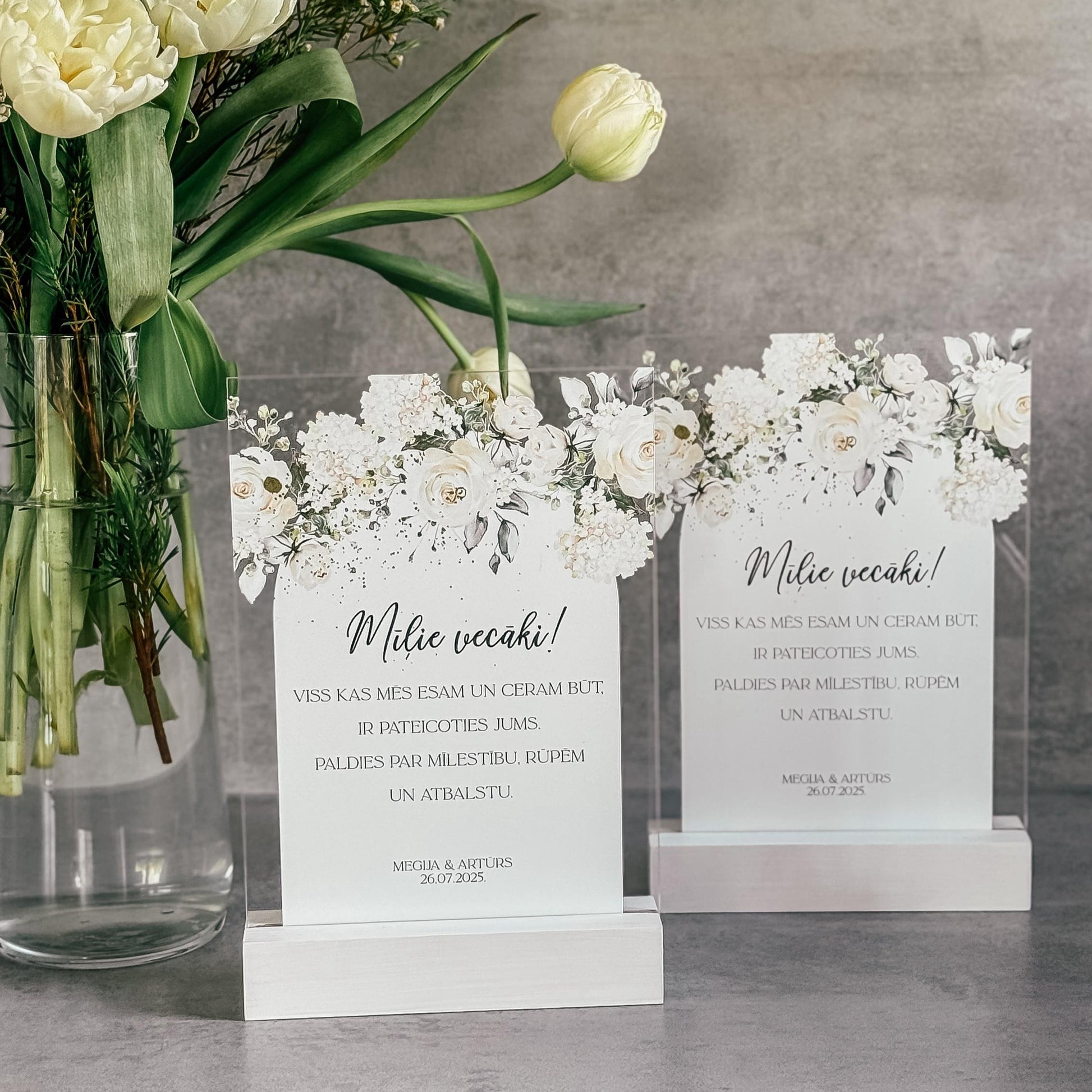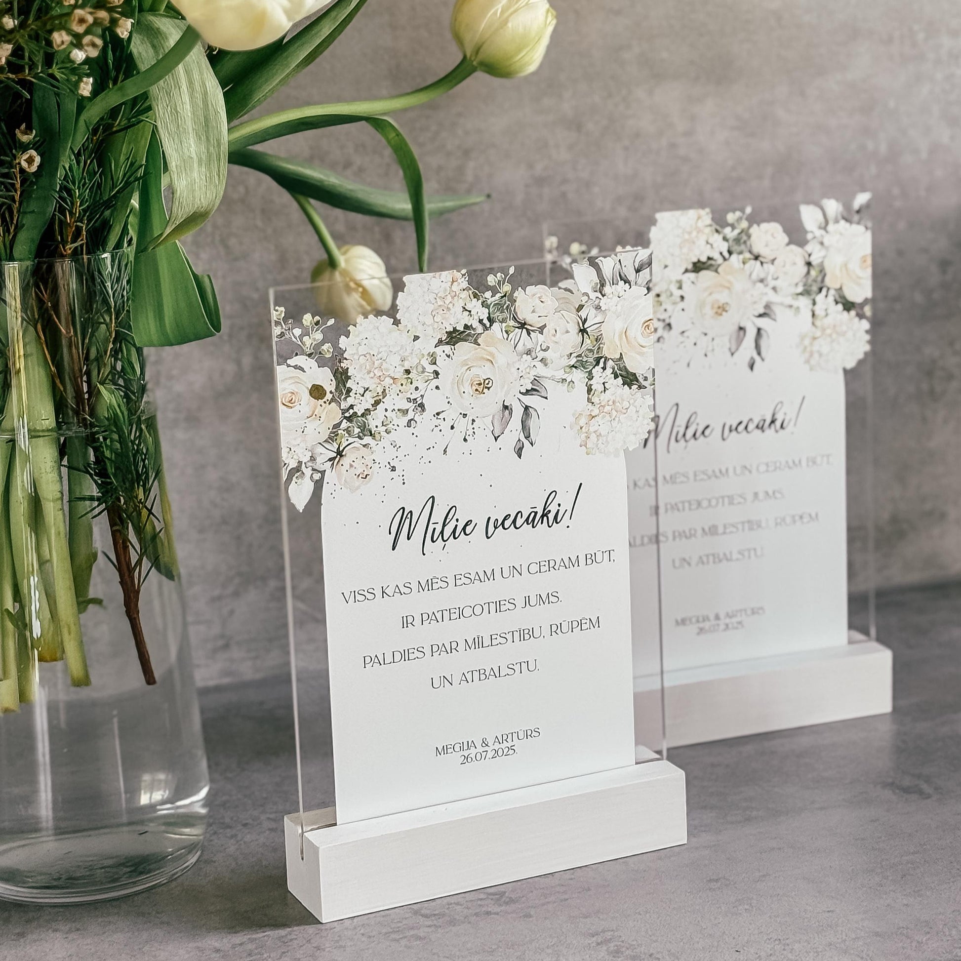 PATEICĪBAS DEKORS AR BALTIEM ZIEDIEM "VISS KAS MĒS ESAM UN CERAM BŪT" I ORGANISKĀ STIKLA DEKORS KOKA STATĪVĀ