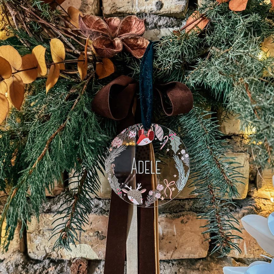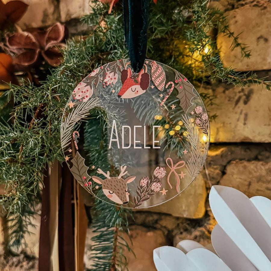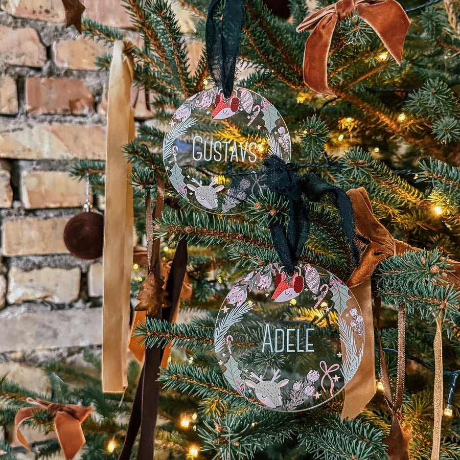 Caurspīdīgi, organiskā stikla eglīšu rotājumi ar vārdu.