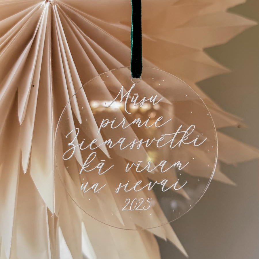 Caurspīdīgs organiskā stikla eglīšu rotājums ar personalizētu tekstu - "Mūsu pirmie Ziemassvētki kā sievai un vīram".
