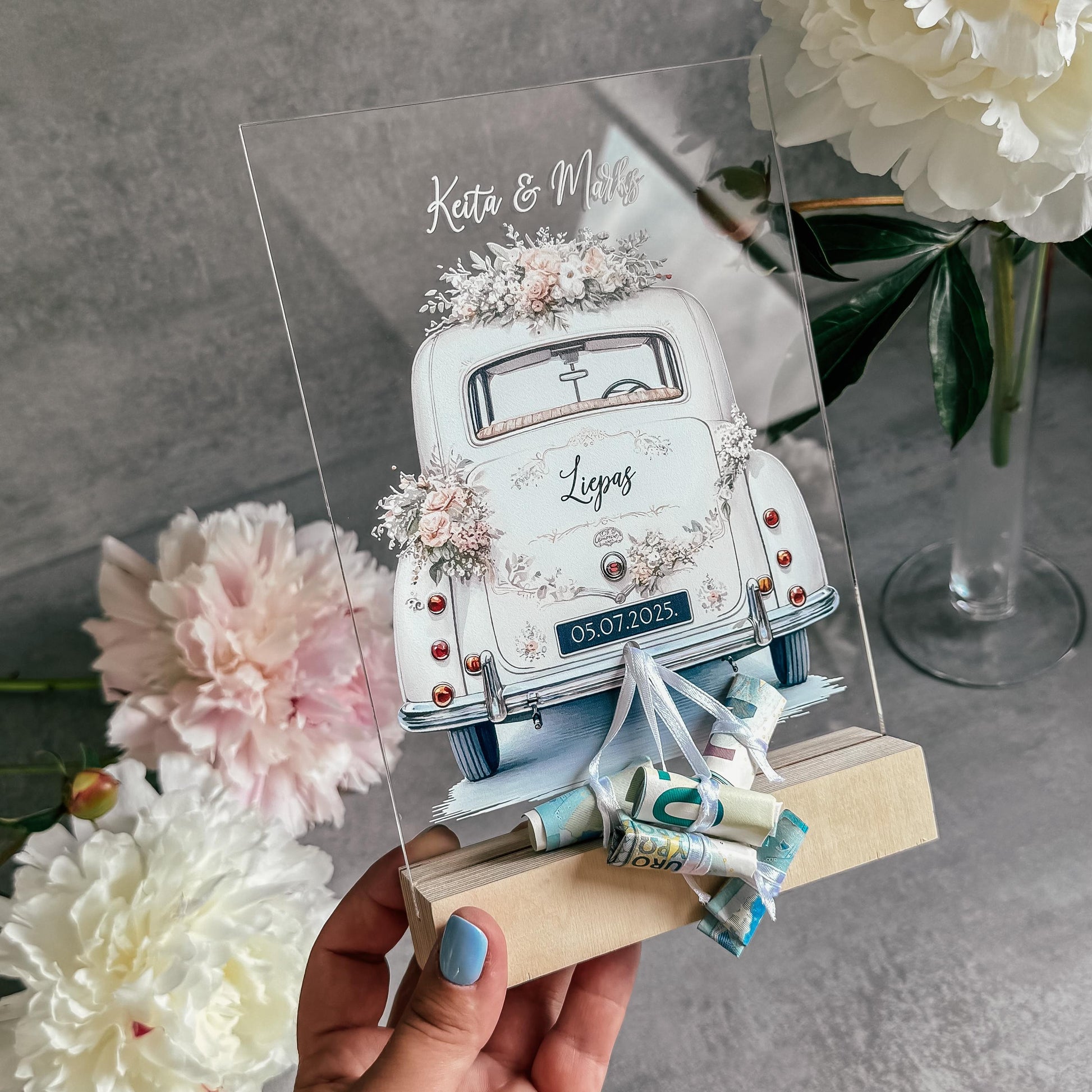 Personalizēts organiskā stikla dekors kāzu tematikā, kurā ir iestrādātas piecas lentītes, lai tajās iesietu sarullētas naudas banknotes.