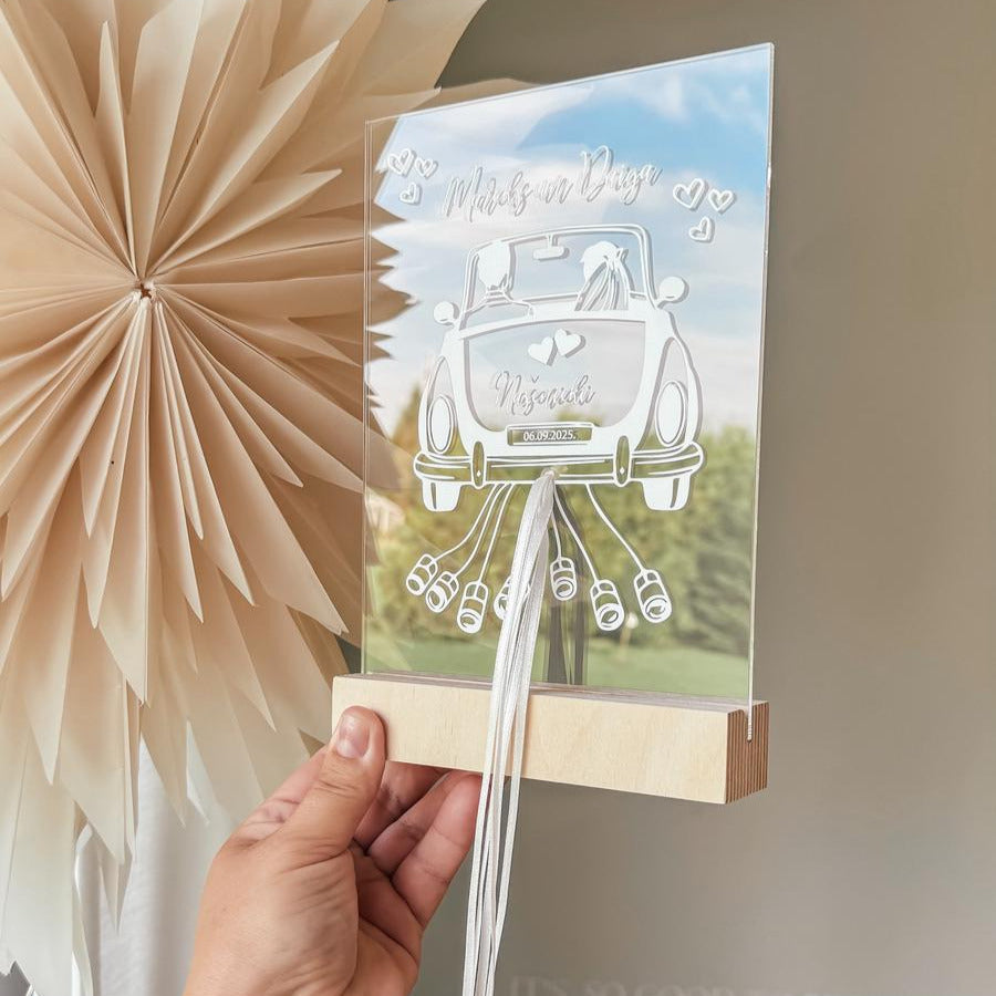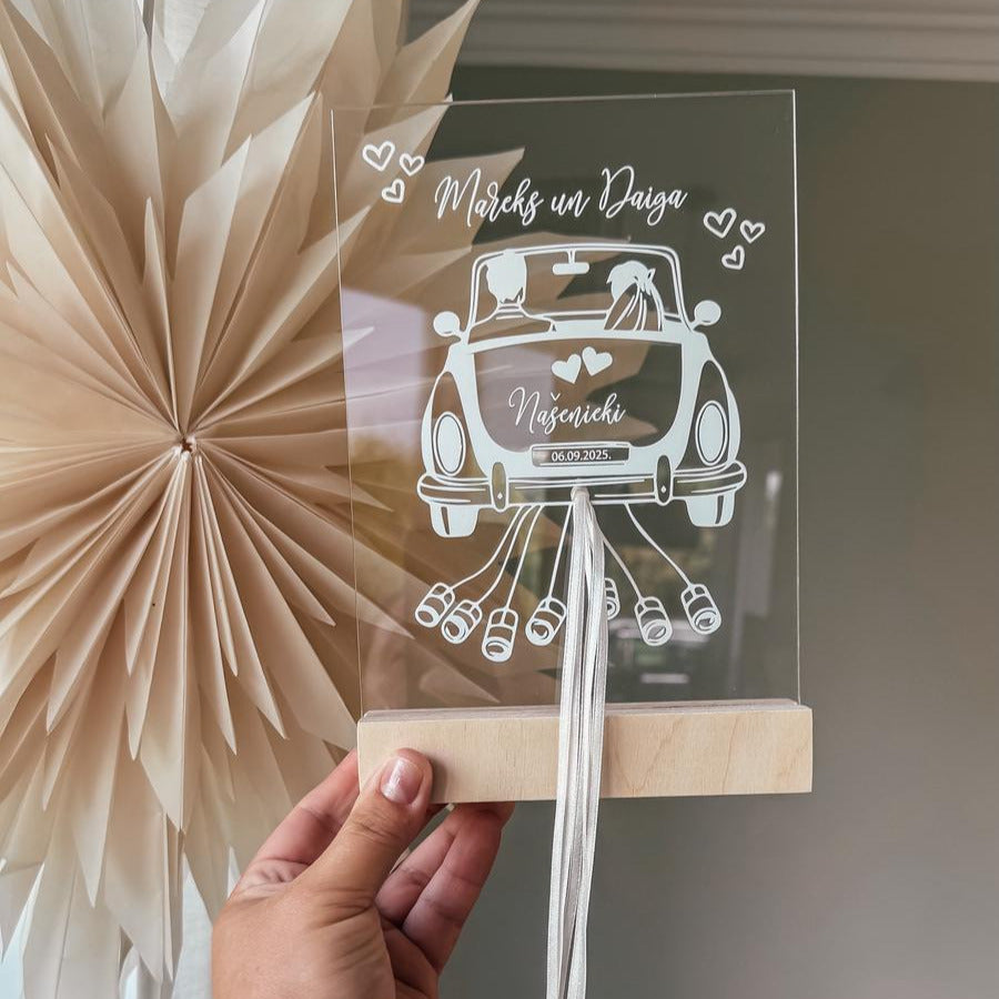 Personalizēts organiskā stikla dekors kāzu tematikā, kurā ir iestrādātas piecas lentītes, lai tajās iesietu sarullētas naudas banknotes.