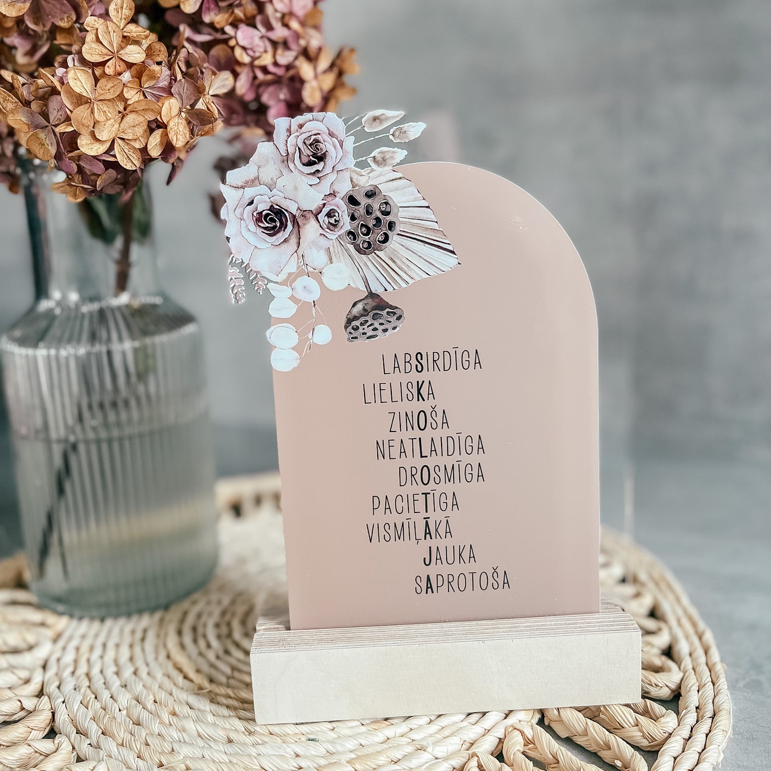 Personalizēts organiskā stikla dekors koka statīvā ar īpašības vārdiem būs lieliska dāvana skolotājai. Šis dekors noteikti sasildīs viņa/as sirsniņu.