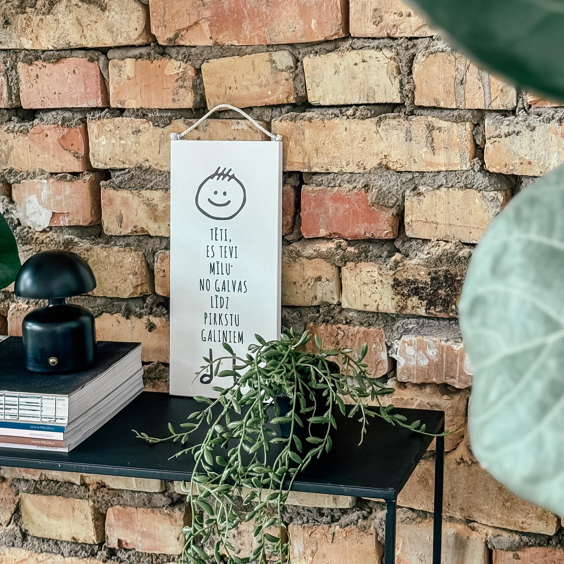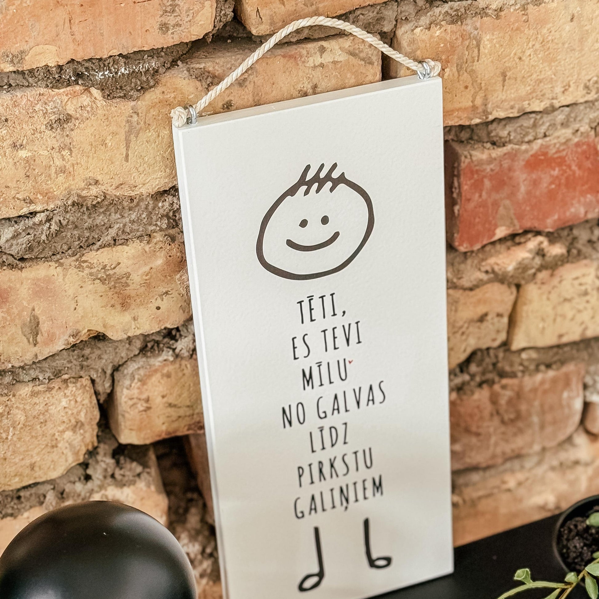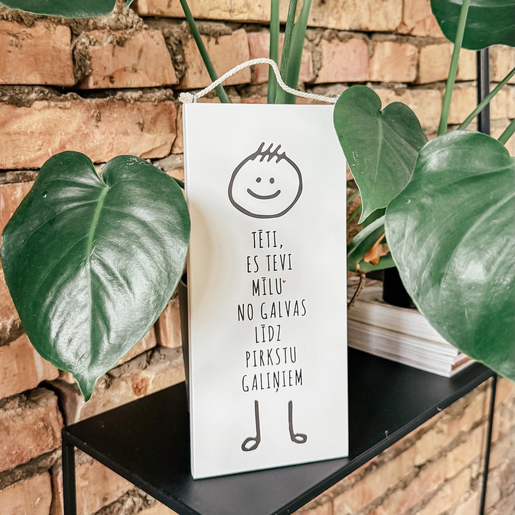 Stilizēts bērna zīmējums uz koka dekora ar mīlestības pilniem vārdiem.